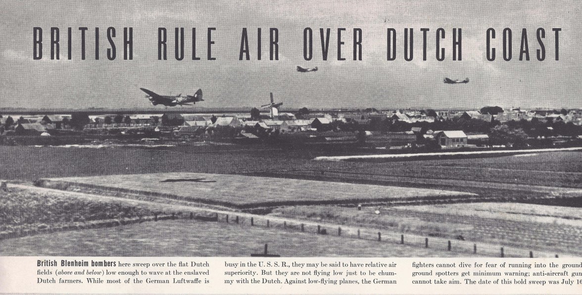 British Blenheim Bombers here sweep over the flat Dutch fields low enough to wave to the enslaved Dutch farmers. While most of the German Luftwaffe is busy in the U.S.S.R., they may be said to have relative air superiority. But they are not flying low just to be chummy with the Dutch. Against low-flying planes, the German fighters cannot dive for fear of running into the ground, ground spotters get minimum warning; anti-aircraft guns cannot take aim. The date of this sweep was July 16.