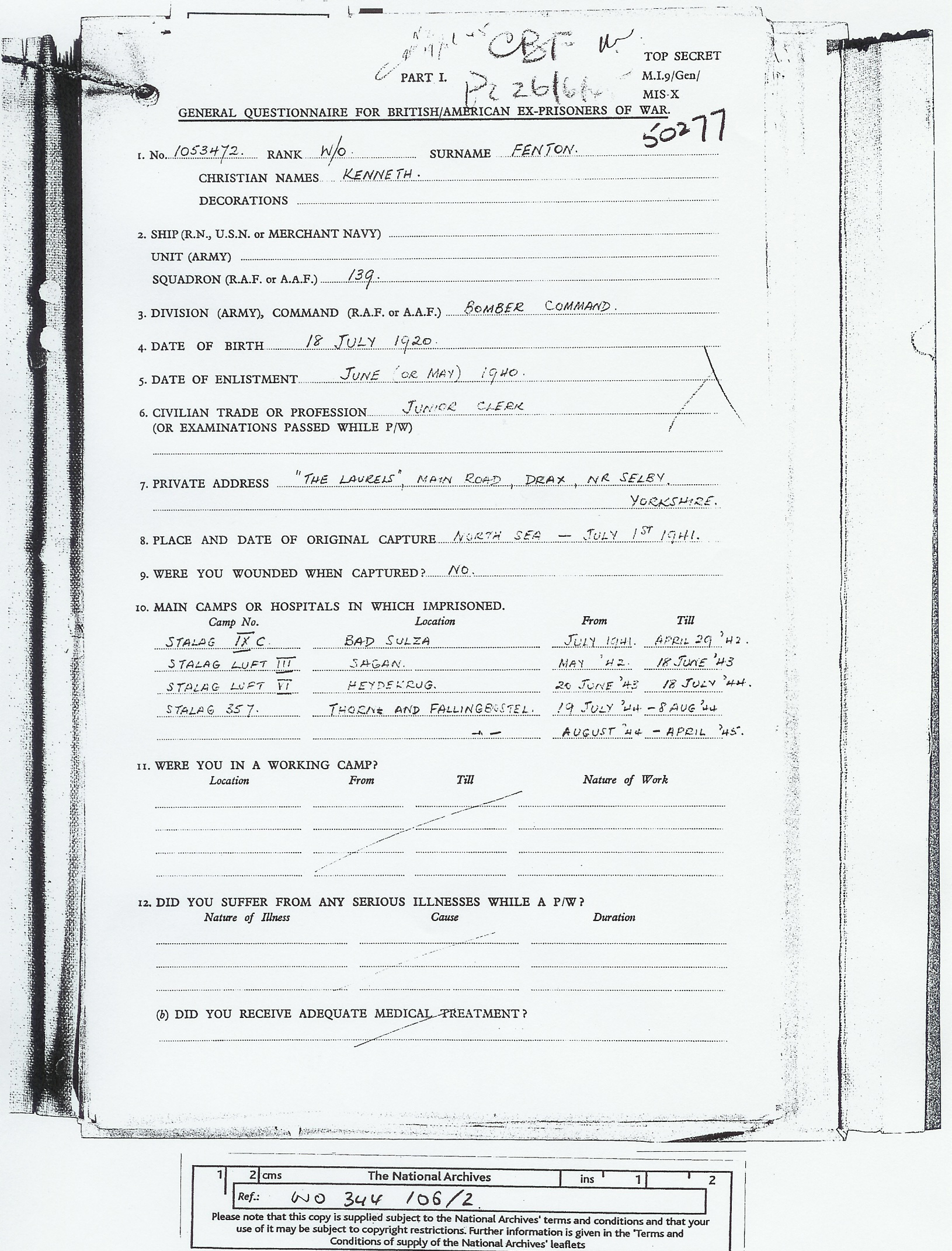 When they landed at RAF Cosford, they were taken to a hanger, set up as a welcome centre, with flags and welcome signs flying. WAAF’s were on hand to give out tea and they received advance pay, rest and then re-kitted with uniforms and interrogated by intelligence officers. Ken Fenton arrived at 106PRC (Personnel Receiving/reception Centre) RAF Cosford, Shropshire, on the 10th May 1945. He completed his Prisoner of War Liberation Questionnaire the next day, 11th May 1945.