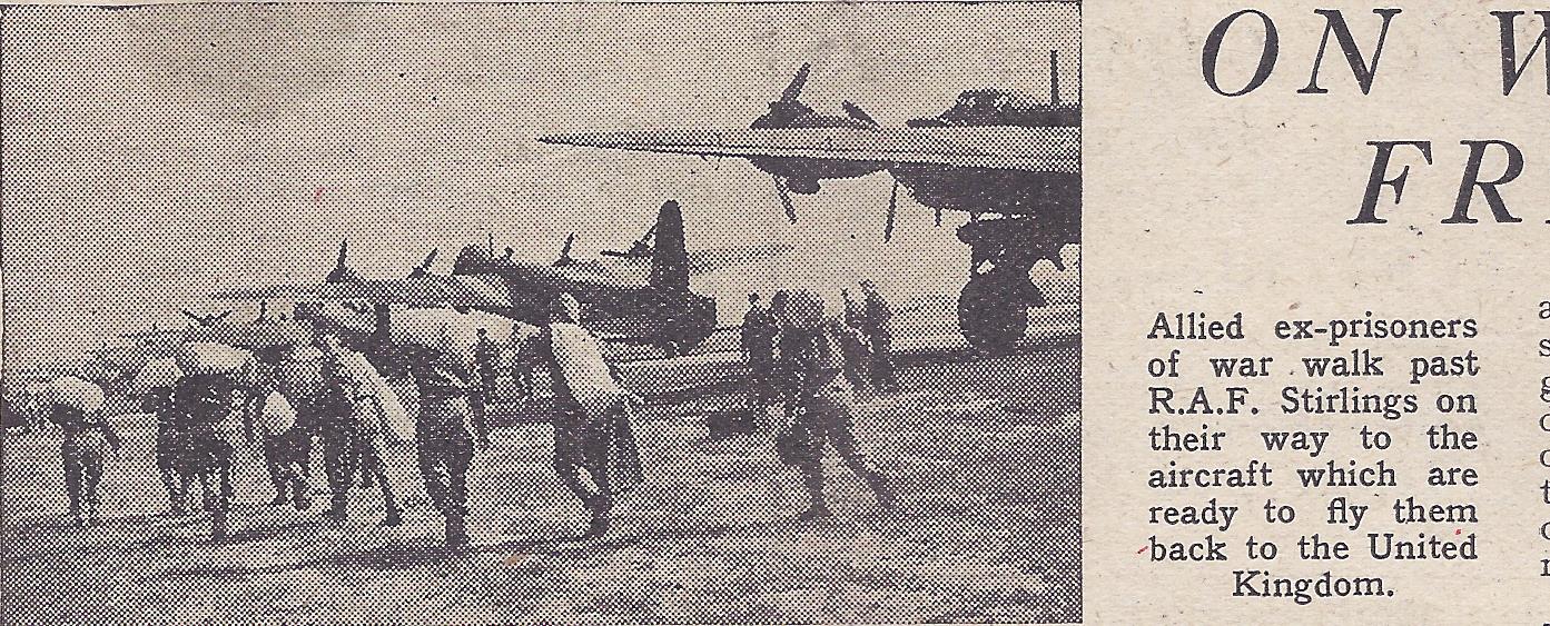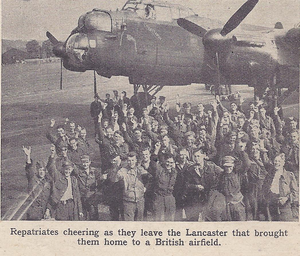 George Spenceley’s “Final flight in a converted Lancaster, along with army wounded and with a further bottle of champagne under my blanket, was, I think, to Boscombe Down. We were taken to a hangar where a group from the W.V.S. had prepared a meal for us. For former prisoners it was too generous. My stomach rebelled and it was some days before I could manage anything but a very basic diet. My memories of my first night in England in the station sick quarters is of embraces from drunken nurses, for this was 8th May, V.E. Day.”