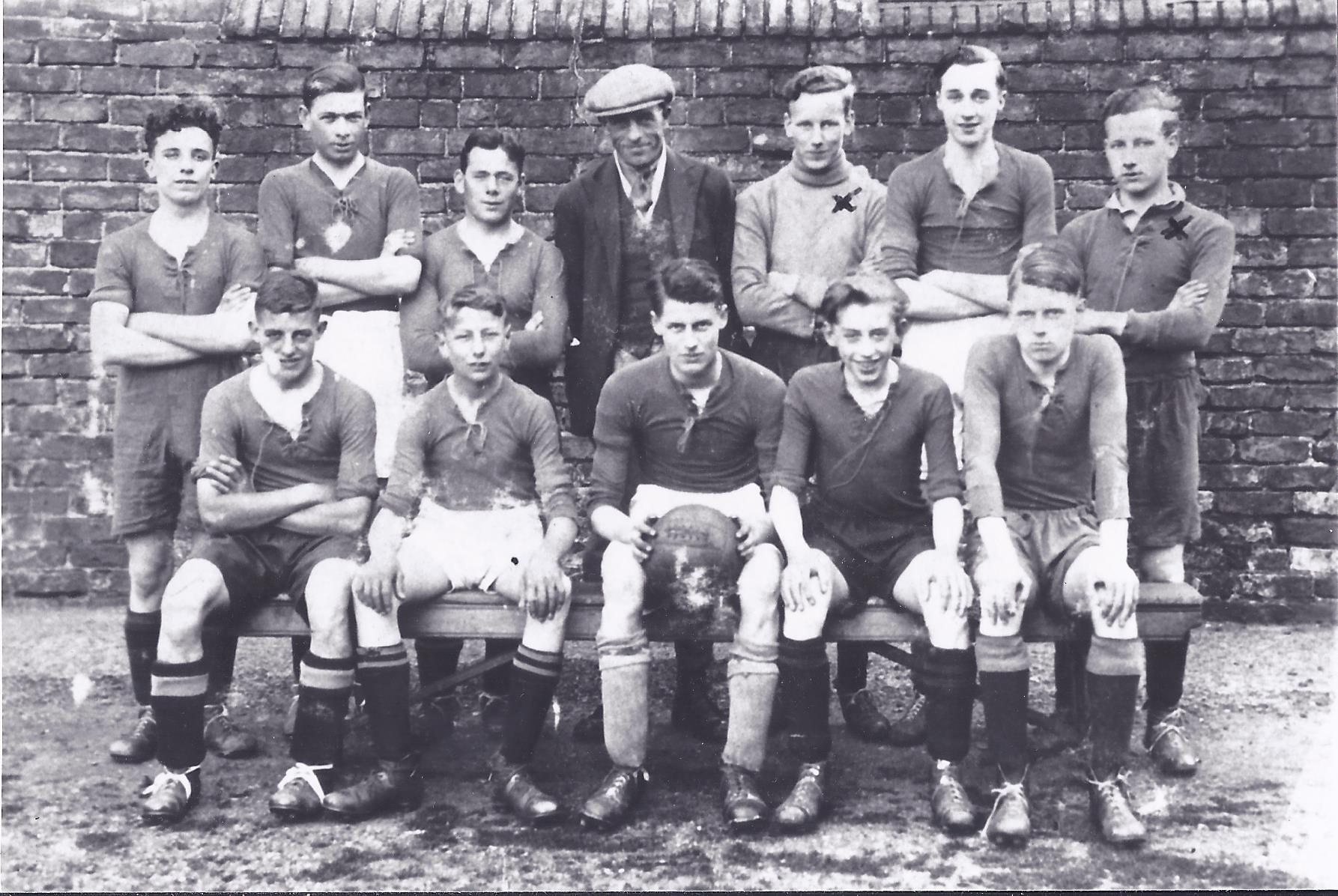 Ken, as a young man, playing football as a goalkeeper together with his brother Tom Fenton, back row, far right.
