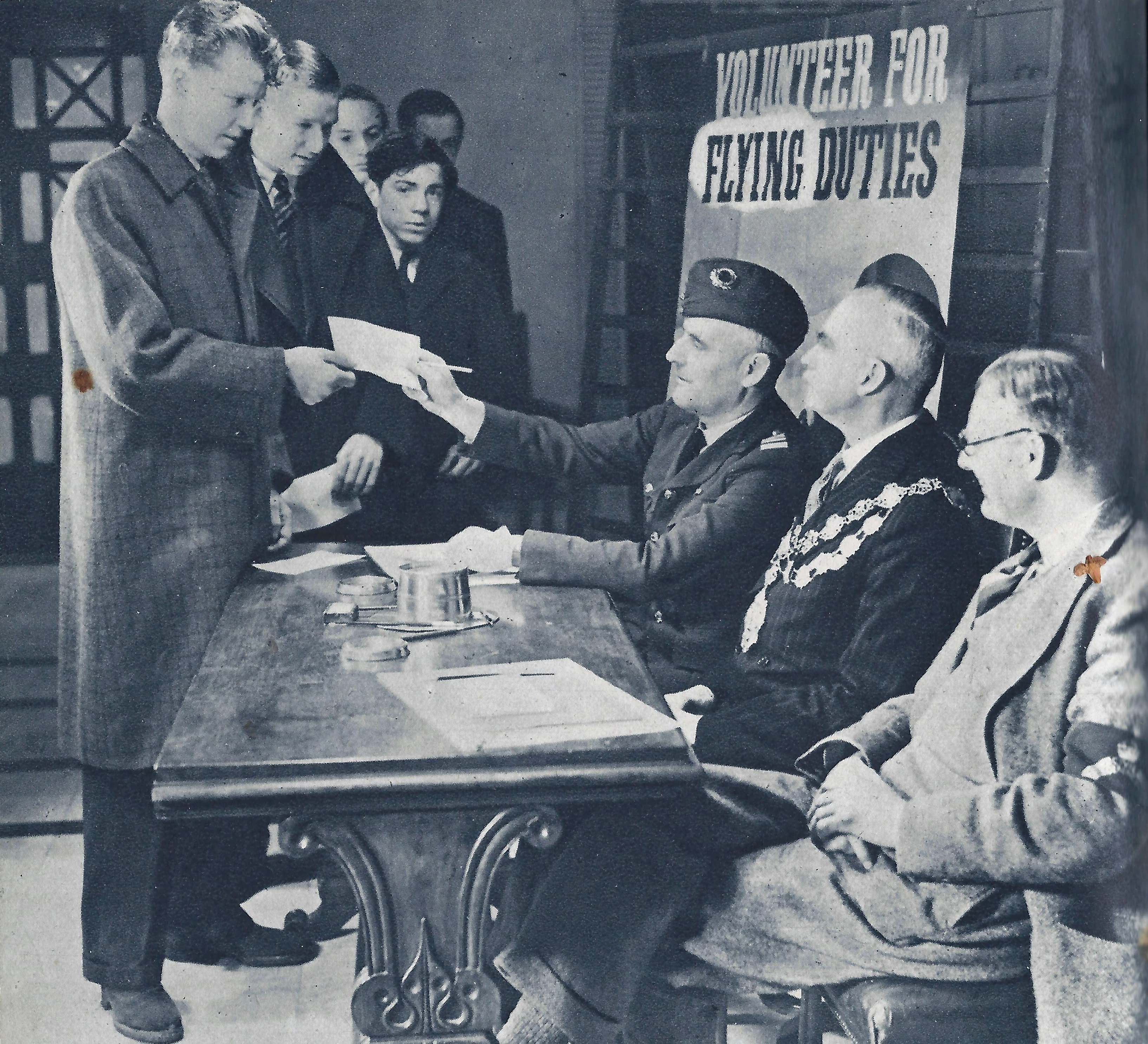 ‘The first stage at a R.A.F. receiving Wing, where newly-arrived cadets are receiving their full complement of kit and equipment before they start training. They have successfully passed the candidates selection board.’