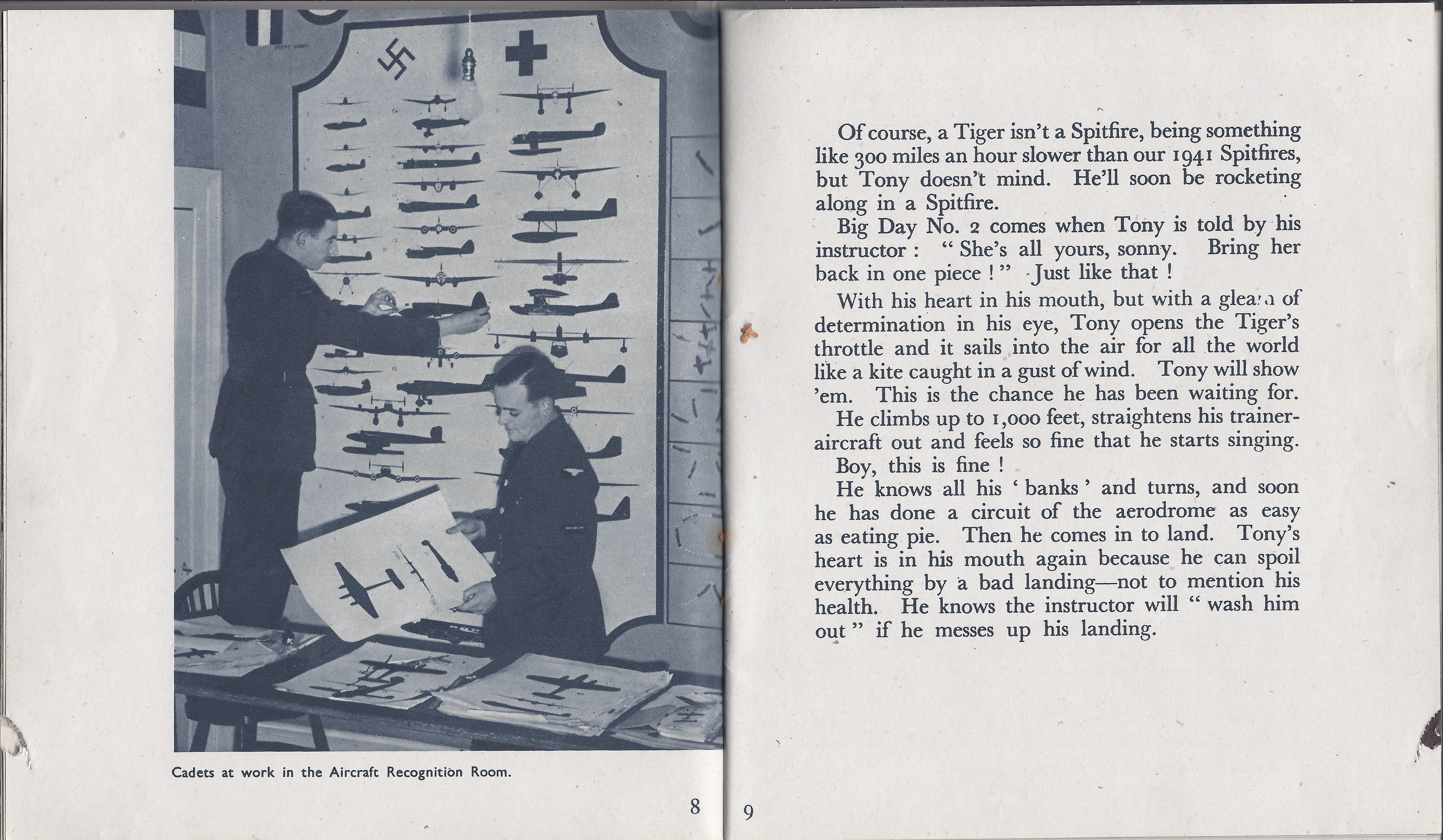’Towards the end of the course we had to learn night flying. Before this we had a night vision test. We sat in pitch darkness for a few hours and then some tiny and extremely ill-lit pictures appeared in holes in a block screen. I simply could not see what any of them were whereas my neighbours were blithely writing down their answers on pieces of paper provided for the purpose. Something desperate had to be done and a whispered consultation helped greatly. Actually when l found the knack l wasn’t quite so bad. While staring fixedly at one picture and making nothing of it l suddenly noticed quite clearly that the one next door to it was a tank. When l looked at it directly it disappeared into the murk. That was the secret. You could see them much more clearly as long as you didn’t look straight at them.’