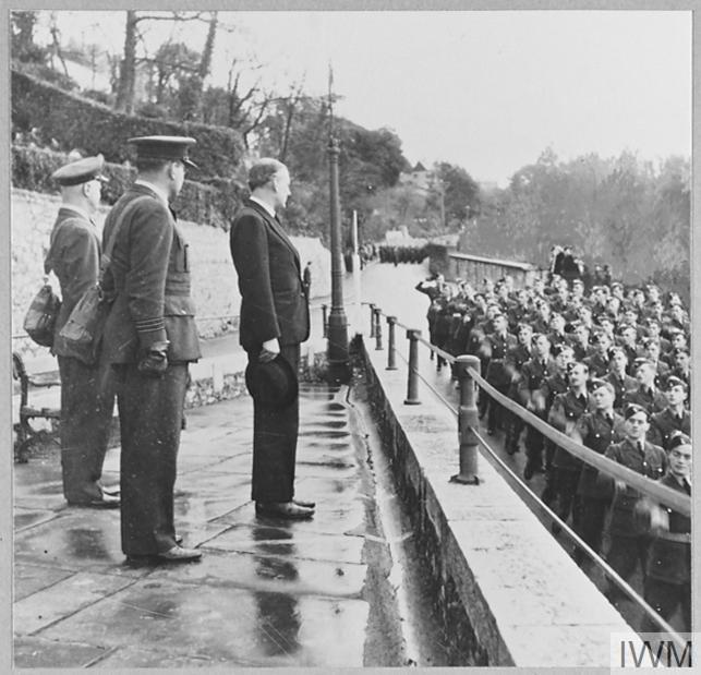 THEY WILL FLY AGAINST THE ENEMY (CH 2107) Original wartime caption: Captain Balfour, accompanied by the Air Commodore in charge of initial training of aircrews, watched a march past by cadets at the I.T.W. Copyright: © IWM. Original Source: http://www.iwm.org.uk/collections/item/object/205443286