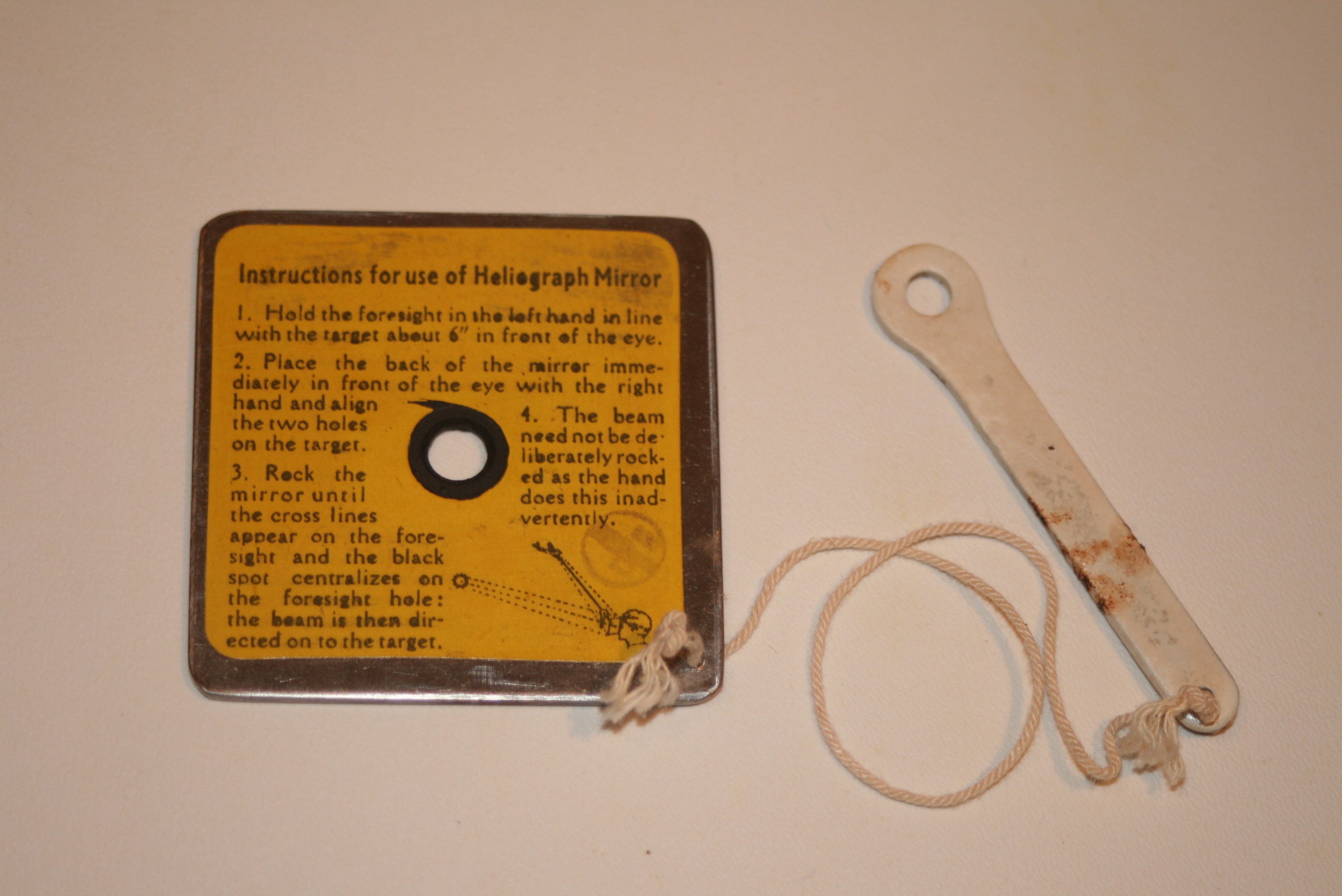 The heliograph consisted of a mirror with a hole in it and a cross etched onto the back and a sighting scope which was a small arm with a white face and aiming hole.