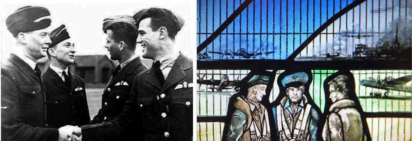 LAC John Kinnane (left) receiving his wings after training in Canada and the 7 Squadron memorial window at All Saints Church in Longstanton.