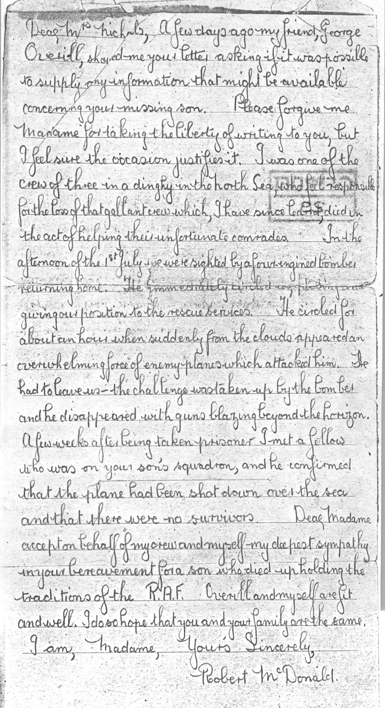 Dear Mrs Nicholls, A few days ago my friend, George Overill, showed me your letter, asking if it was possible to supply any information that might be available concerning your missing son. Please forgive me madame for taking the liberty of writing to you but I feel sure the occasion justifies it. I was one of the crew of three in a dinghy in the North Sea, who feel responsible for the loss of that gallant crew which, l have since learned, died in the act of helping their unfortunate comrades. In the afternoon of the 1st July (1941), we were sighted by a four engined bomber returning home. He immediately circled ………………..giving our position to the rescue services. He circled for about an hour when suddenly from the clouds appeared an overwhelming force of enemy planes which attacked him. He had to leave us-the challenge was taken up by the bomber and he disappeared with guns blazing beyond the horizon.